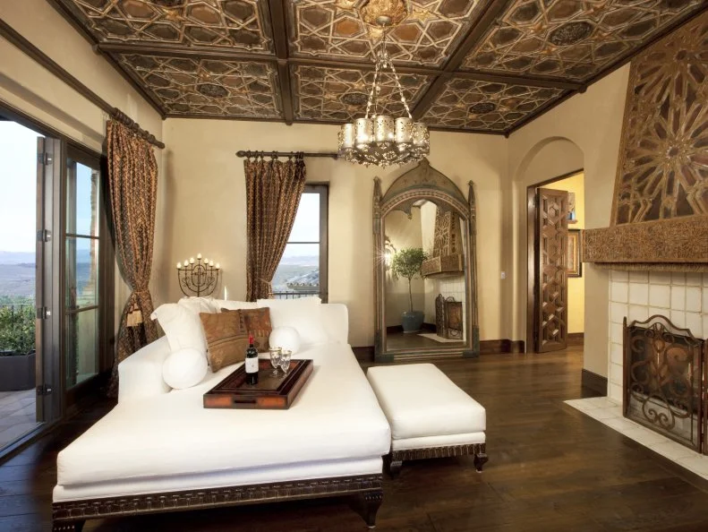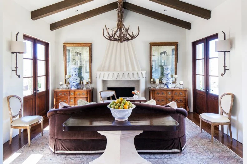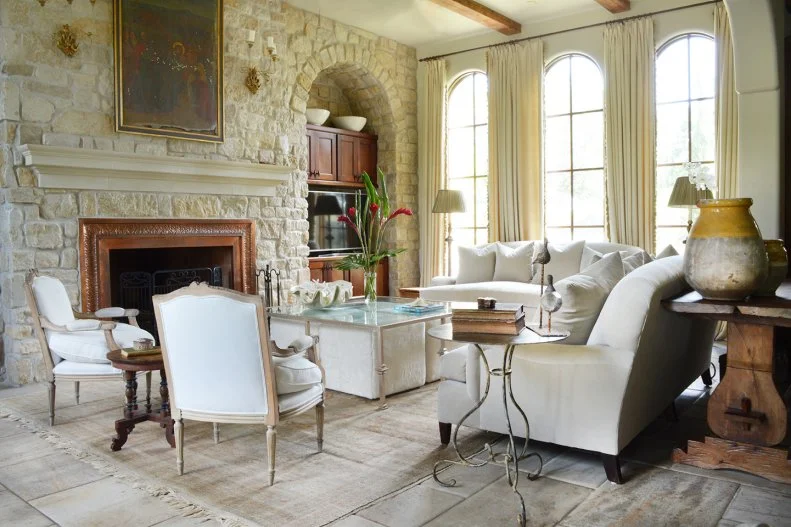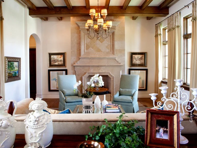 The Mediterranean style has a warm color palette with natural accents. In this living room, cream colored