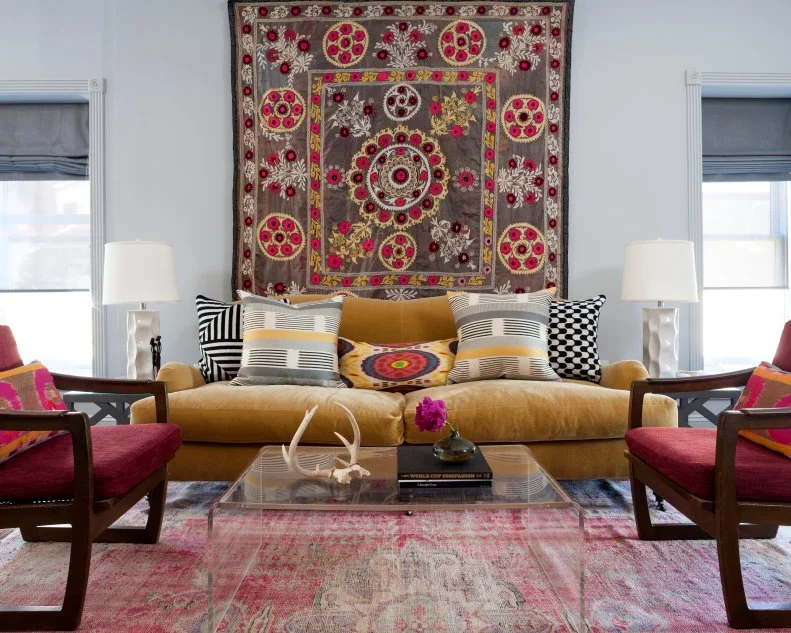 Bohemian style combines colors, patterns and textures to create a one-of-a-kind look. A gorgeous wall tapestry, featuring fuchsia and burgundy, sets a colorful backdrop for the mix of patterns and rich hues seen throughout this boho living room. This comfortable space is full of color and culture, creating a bohemian vibe.