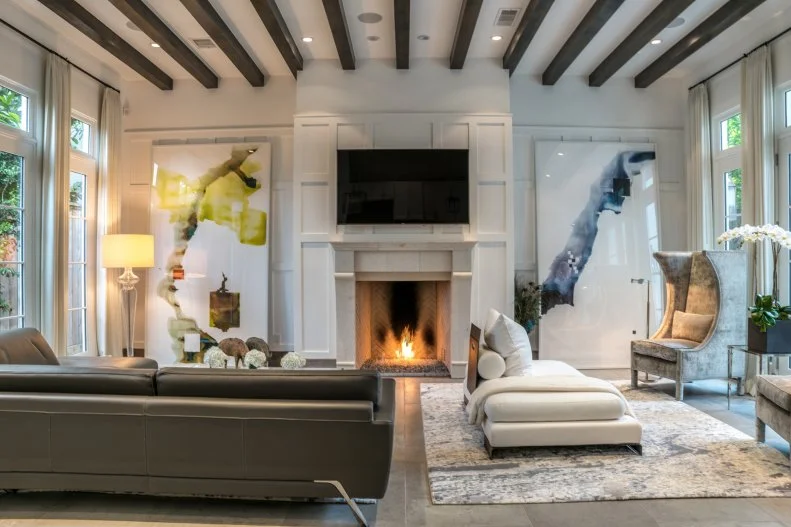 Hollywood glamor is amazing and fun. This design style often features gold accents, bold artwork and luxe furnishings, all of which can be seen in this living space.