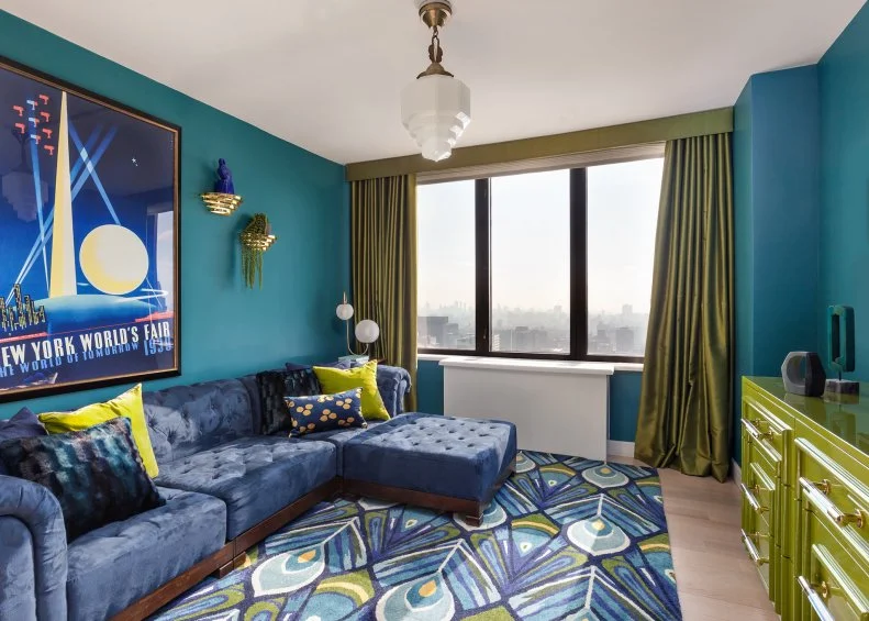 Lime green and turquoise are a powerful duo that invigorate the space with color and energy, another feature of the art style.