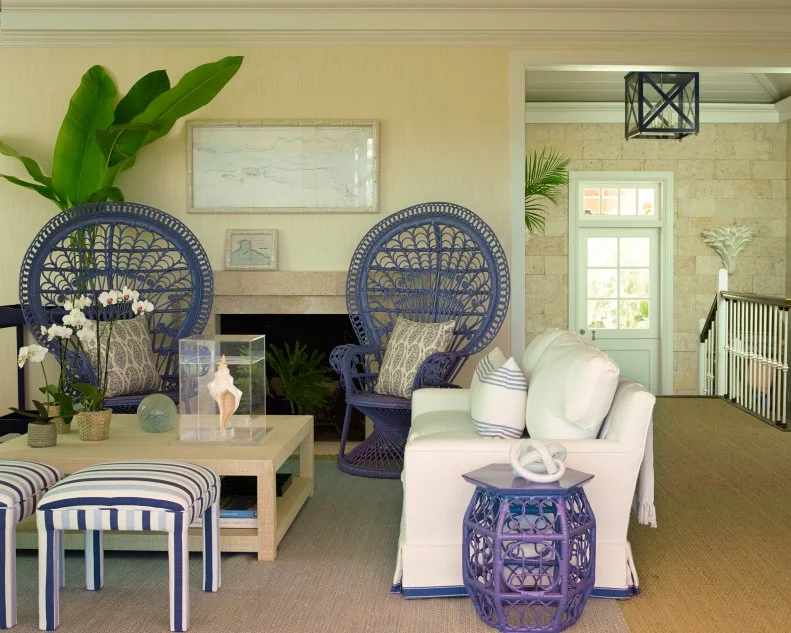 bright, bright colors that mimic the outdoor environment. Often seen in coastal-style designs, natural and woven materials add texture. This open-concept beach living room features bright pops of blues and greens and beach art, paired with neutral furnishings.