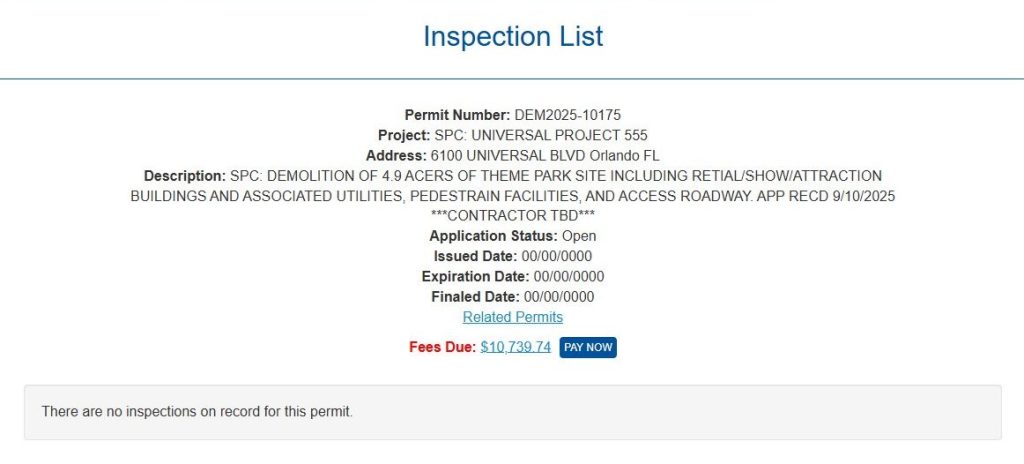 Permits have been filed in September 2025 for the demolition of other buildings within Islands of Adventure. The first of these permits specified “the demolition of 4.9 hectares of parkland that includes retail/exhibition/attraction buildings and related facilities, pedestrian facilities and an access road.”